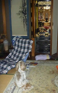 私が寝ころがっていた場所で、仏壇に向かって「原稿が間に合いますように・・・」と祈ってくれている愛犬ぷりん。(携帯も資料探しの本も枕も投げっぱなしになっている・・・・)