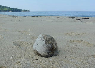 (傷だらけになりながら、琴ヶ浜まで流れ着いたヤシの実。いったいどのくらい海をただよって来たのだろう?)