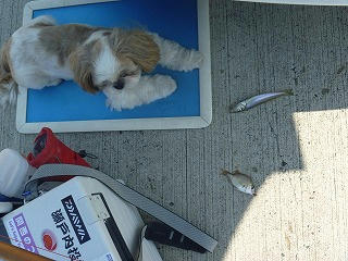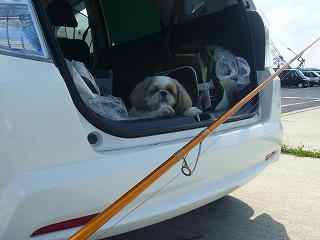 (涼しい車の中から、私の釣りを見ている愛犬ぷりん)