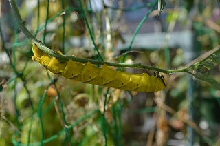 (トマトの葉っぱ限定で食べつくしている黄色いスズメガの仲間の幼虫)