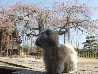 樹齢数百年のしだれ桜をバックに、円立寺本堂を見上げてお参りしているかのような愛犬ぷりんです。