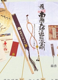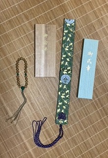 四国遍路と言えば、いろんなものが必要になるが、中でも中央の数珠と輪袈裟は真言宗のもの。