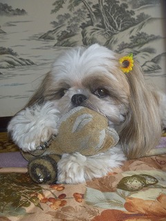 下の写真のように、いつも噛まれていたアライグマのぬいぐるみは、今でも仏さまになった愛犬ぷりんに常に寄り添っています。