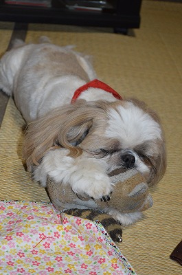 アライグマのぬいぐるみを抱き寄せて噛んでいると安心するのか?いつもスヤスヤ寝ていました。