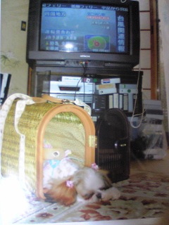 (ぷりんの小さいころ台風の時も、ケージの中に避難していました、テレビが古いですねぇ)
