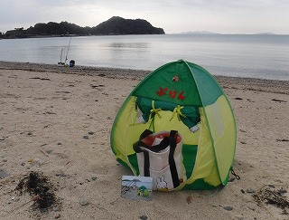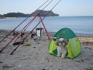 (2007年6月に、myテント持参で蒲刈に行った愛犬ぷりん。逃げるどころか、家でもどこでも私から5m以上は離れないのだから、家の近所でのお散歩以外はリードは無しでした)
