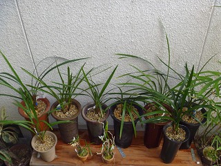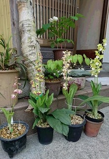 (植え込みが済んだ8株と、セッコクの黄花覆輪と白花素心を一緒に写してみました)