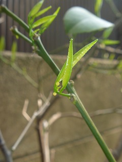 今日は、樹高1mもないレモンとデコポンの木に、早々とアゲハチョウの卵が、合わせて13個も産みつけられていました