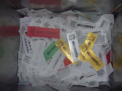納札箱の中にはいろんな色をした納め札があり、1回から4回までのお遍路さんは白いお札、5回から6回の人は緑色、7回から24回は赤色、25回から49回は銀色、50回から99回のお遍路さんは金色の納め札、100回以上は特注の錦の納め札になるわけです。