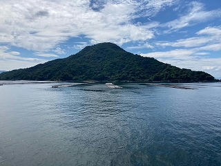 正面こぶこぶの島、世界遺産安芸の宮島をバックに、似島の家下(やじた)港に向かっている似島汽船のフェリー。