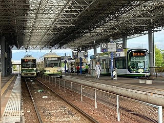 (広島港の広電路面電車乗り場、新旧電車のそろい踏み)