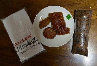 (いただいて帰ったあくまきと、このあと行った竹屋本館の女将さんにいただいた記念タオル)
