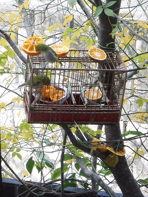他にも、愛犬ぷりんが元気だったころ、甲高い声でメジロを脅してはミカンを食い荒らしていたひよどりを追っ払っては、メジロが食べるときはやさしく見守っていた・・・・・・、そんな状況でメジロさんたちに今でも毎日みかんを上げています。