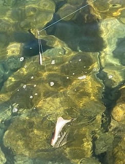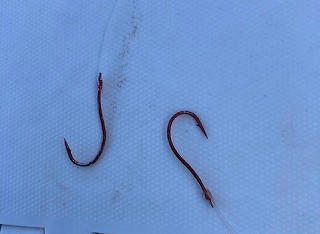 (一度だけ、ドラグも鳴らない強い辺りがあったが、少し巻いたところで軽くなり、上げたらこのとおり、処分するつもりだったが二セットだけ残っていたハリを使った自分を笑うしかない・・・・・