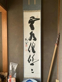 「正月飾りいつ飾る?」と観たら、28日がいいとのことなので、これまで床の間に掛けていた《雲水倶悠々》の掛け軸から、《松竹梅》の掛け軸に。
