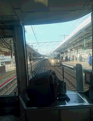 (神戸元町駅でのJR電車、置かれているのは私の上着とバック)
