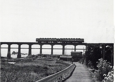 (波しぶきと一緒に撮りたかったのだが、波しぶきが上がった時気動車は、まだまだ鉄橋の向こう端、赤い車体がかすかに見えます)