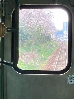先頭に乗ったには訳があり、いつも道路から眺めている線路沿いの桜並木を、車両内から撮ってみたいと思ったから。