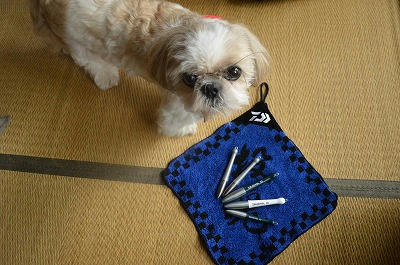 (在りし日の愛犬ぷりんとダイワフロートシンカー)