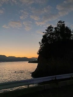 (朝焼けの空には、三日月が明るく輝いている)