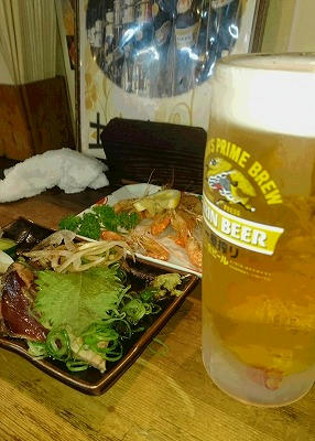 まず最初はベタだが、明神丸の鰹タタキセット、鰹の刺し身、鰹の握りずしなど4品とキリン一番搾り生