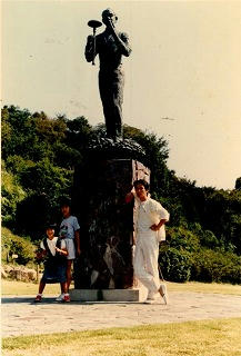 (牧野富太郎博士の銅像の前でポーズをとっている若き日の私、スマートだったなぁ)