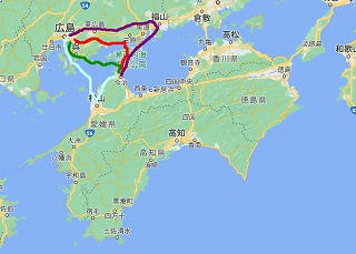 わが家からだと、一番速いのは❷だが、福山市辺りまで走って戻る感じがたまらなく嫌で、急がないときは❸を使うが、一番楽な気持ちになれるのは➍です。