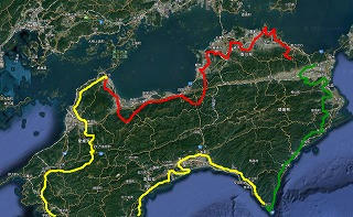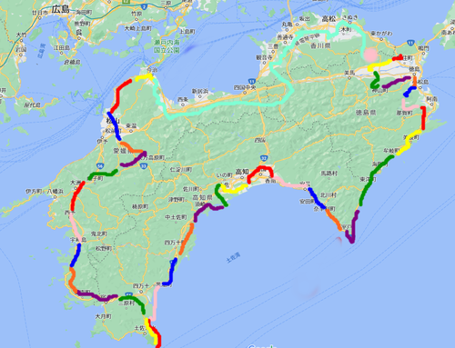 今日、8時10分今治行きの高速バスに乗って、24日の結願を目指して下の地図、水色の線に沿って12日の行程で約350km歩いてきます