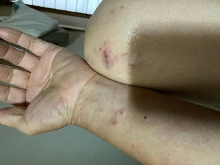 (膝と手首に、痛々しい傷が。左手首には時計のバックルが食い込んだ跡が
